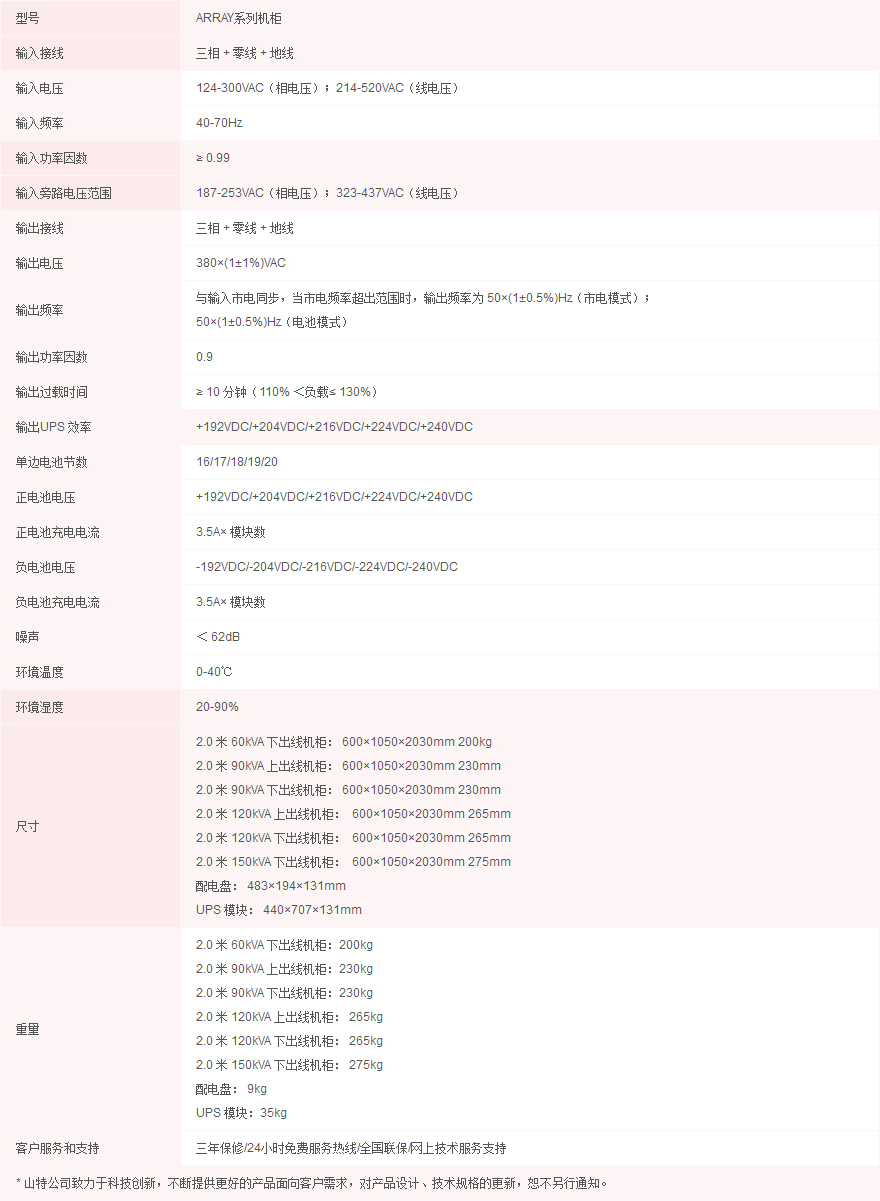 3A3 Pro UPS一个UPS模块体积为440×700×131mm(3U),一个标准2米高的UPS机柜最多可以安装10个UPS模块,总容量达到150KVA,而且配电盘也含在其中,再配上与UPS机柜一般大小的电池柜,便可组成完整的UPS供电系统。由于UPS机柜和电池柜都采用标准机柜,与大多数机房的负载设备机柜一致,因此可以与负载并排放置而无需专用的UPS配电房,不仅美观而且能为客户最大限度地节省安装空间。