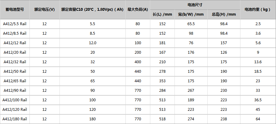 ●额定容量:C10:5.5~180Ah@20℃