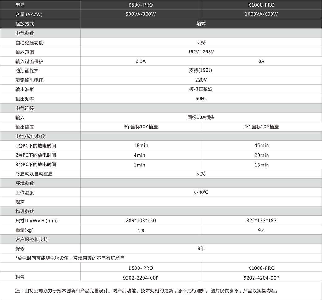 山特K500/K1000 PRO (2014)是针对中国市场电力环境优化设计的自动稳压型UPS,通过先进MCU控制及可靠功率设计,有效的解决5种电力问题(市电断电、电压下陷、浪涌、欠压、过压),同时进一步提高了产品的适应性和可靠性,为用户设备以及UPS本身 提供万无一失的保障。