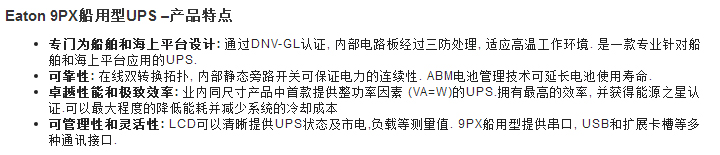 9PX 船用型UPS是业内同尺寸产品中首款提供整功率因素 (VA=W)的UPS. 比其他UPS提供多11%的能量. 9PX船用型拥有最高的效率, 并获得能源之星认证.可以最大程度的降低能耗并减少系统的冷却成本.