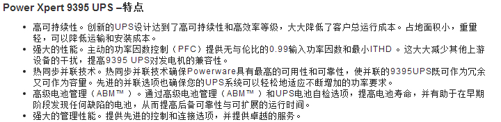 Power Xpert 9395UPS,结合技术创新,提供丰富功能。为大型数据中心,医疗设施和其他核心系统提供高功率密度的一流电源保护。高系统效率显著降低运行费用。双转换拓扑结构使得可靠性万无一失,同步并联技术确保能够满足当前和未来电力需求。