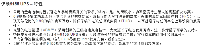 伊顿9155 UPS为公司企业、医疗机构、银行和工业应用场合中的IT和电气工程基础设施或其它关键系统提供优质双转换后备电源和可升级的运行时间。9155 UPS可以用很小的占地空间提供最大的电池运行时间,是真正的全三相电源保护解决方案。