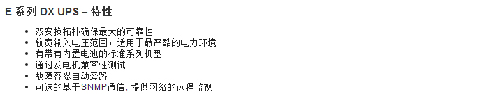 E系列DX UPS双变换式UPS可防止关键任务的应用设备停机、数据丢失和破坏。双变换构架内集成了整流器和逆变器,将输出电力与所有输入异常完全隔离开。E系列DX适应较宽的输入电压范围,避免在轻微的电力波动中使用电池放电,将电池电量省下来在完全失掉电网供电时使用。