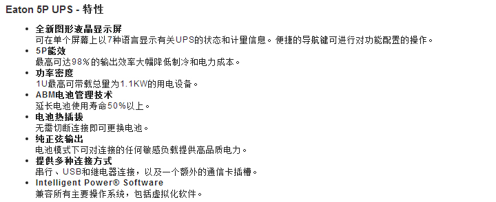 为满足全球客户对UPS日益提升的安全、可靠、有效率及稳定性的需求, EATON集团秉承为客户提供专业整体解决方案的理念,结合当前智能化和绿色环保的发展趋势,推出新一代在线互动式UPS 5P系列650~1550VA,为IT和企业办公设备及网络机房提供更智能、更环保的电力保护方案。